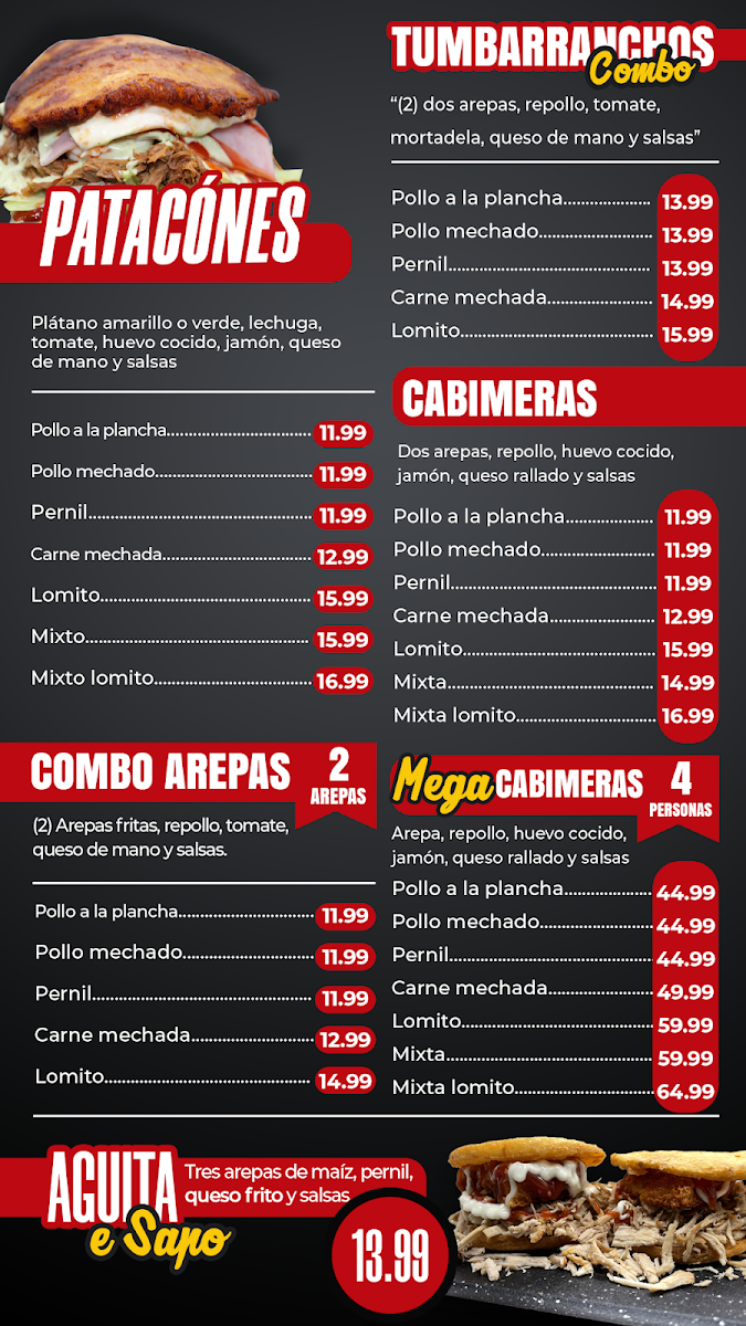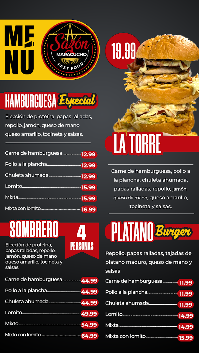 Carne de hamburguesa, Pollo a la Plancha ¿ Chuleta Ahumada, Papas ralladas, repollo, jamon, queso de mano, queso amarillo, tocineta y salsas